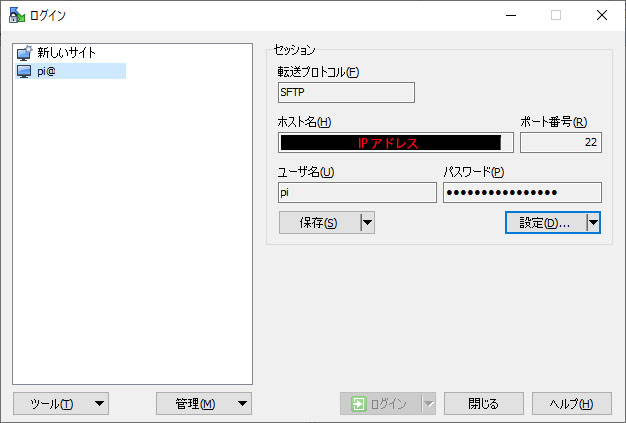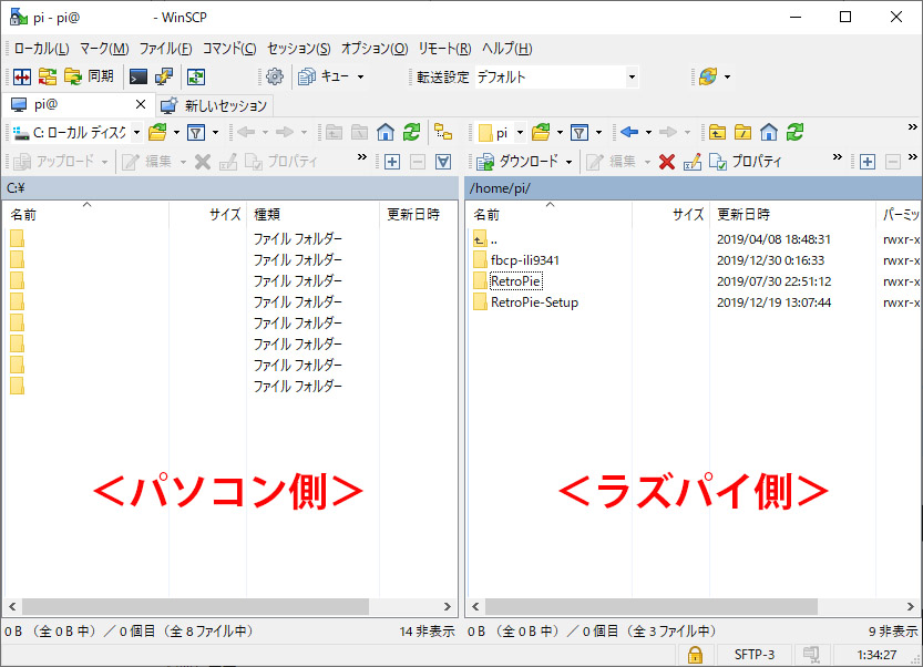 Retro Pie でゲームを動かすには? †Retro Pieの初期状態では、動作に必要なエミュレータプログラムが用意されてはいますが、ゲームのコンテンツ自体は同梱されていません。 SFTP接続によるファイル転送 †SFTPとは? †SFTP (SSH File Transfer Protocol)とは、SSHプロトコルを使ったファイル転送手順です。 ラズパイのリモート設定のために有効化されたSSHを用いて、ラズパイ上へファイルの配置を行います。 ソフトの入手 †パソコンからラズパイへファイルを配置する際に使用します。